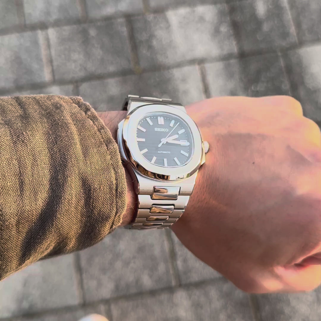 Acier inoxydable 316L • Cadran noir • Bracelet Nautilus